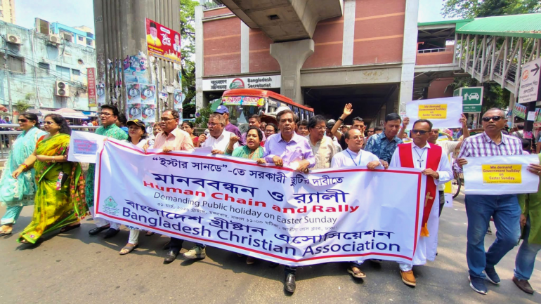 The Bangladesh Christian Association organized a human chain and rally in front of the National Press Club in Dhaka on March 31, calling for a government holiday on Easter Sunday.