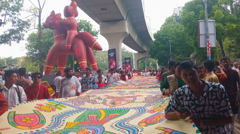 At the heart of the festivities is the iconic New Year procession known as the Mangal Shobhajatra, organized by students and faculty of University of Dhaka. Recognized by UNESCO as an “Intangible Cultural Heritage of Humanity,” the procession features large handcrafted masks, symbolic figures, and artistic displays that convey messages of justice, harmony, and resistance to oppression.