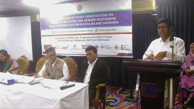 The workshop brought together government officials, disaster management experts, and community representatives to share findings and develop a roadmap for inclusive disaster preparedness. Discussions highlighted the urgent need to integrate disability and gender considerations into early warning systems so that vulnerable groups are not left behind during disasters. The study focused on Khulna and Satkhira, two regions highly exposed to climate-induced hazards.