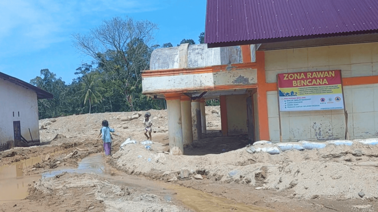 At the time of the visit, thick mud—up to two meters deep—still covered dormitories, school buildings, and a health clinic. Support from the Indonesian National Armed Forces (TNI), including heavy equipment and personnel, was crucial in clearing the area.