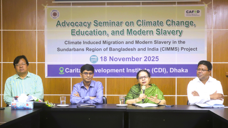 The seminar, titled “Climate Change Impact on Child Education and Modern Slavery,” was organized by Caritas Bangladesh at the Caritas Development Institute. It brought together around 40 participants from government agencies, UN bodies, international and national NGOs, the media, people’s representatives, and community groups. Discussions focused on the study “Climate Change Impacts and Vulnerabilities on Children in the Sundarbans Region: A Study of Child Labor, Education, Health, and Coping Mechanisms.”