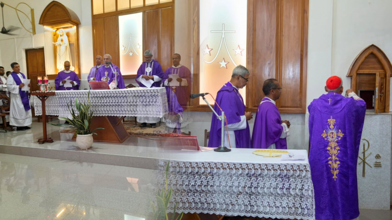 He was joined by Fr. Marlon Rodrigues, OCD, Superior of the Carmelite Monastery, Margao; Fr. Patricio Fernandes, SJ, Rector of Bom Jesus Basilica, Old Goa; Fr. Siran Rebello, SAC, Superior of Pallotti Home, Chicalim; and several other priests as concelebrants.