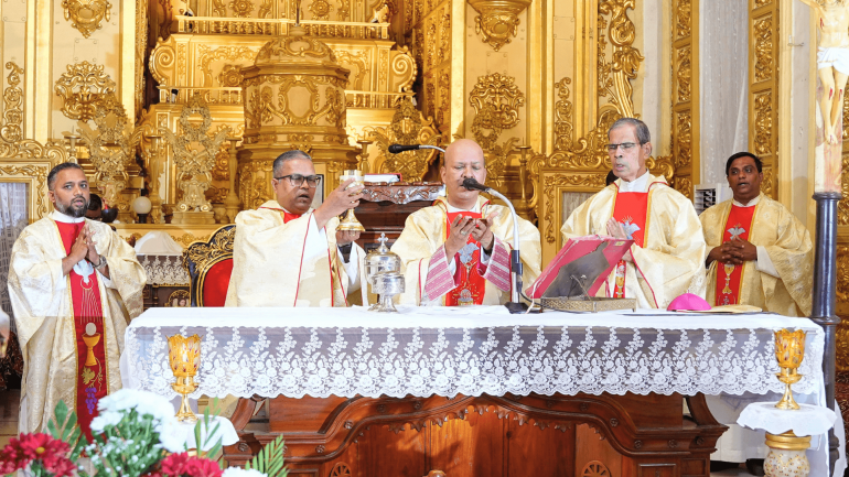 The Eucharistic celebration was presided over by Auxiliary Bishop Simião Fernandes. Fr. Mariano D’Costa, Director of the Diocesan Centre for Biblical Apostolate, Fr. Leonardo Moraes, Parish Priest of St. Jerome’s Church, Mapusa, and other priests concelebrated.