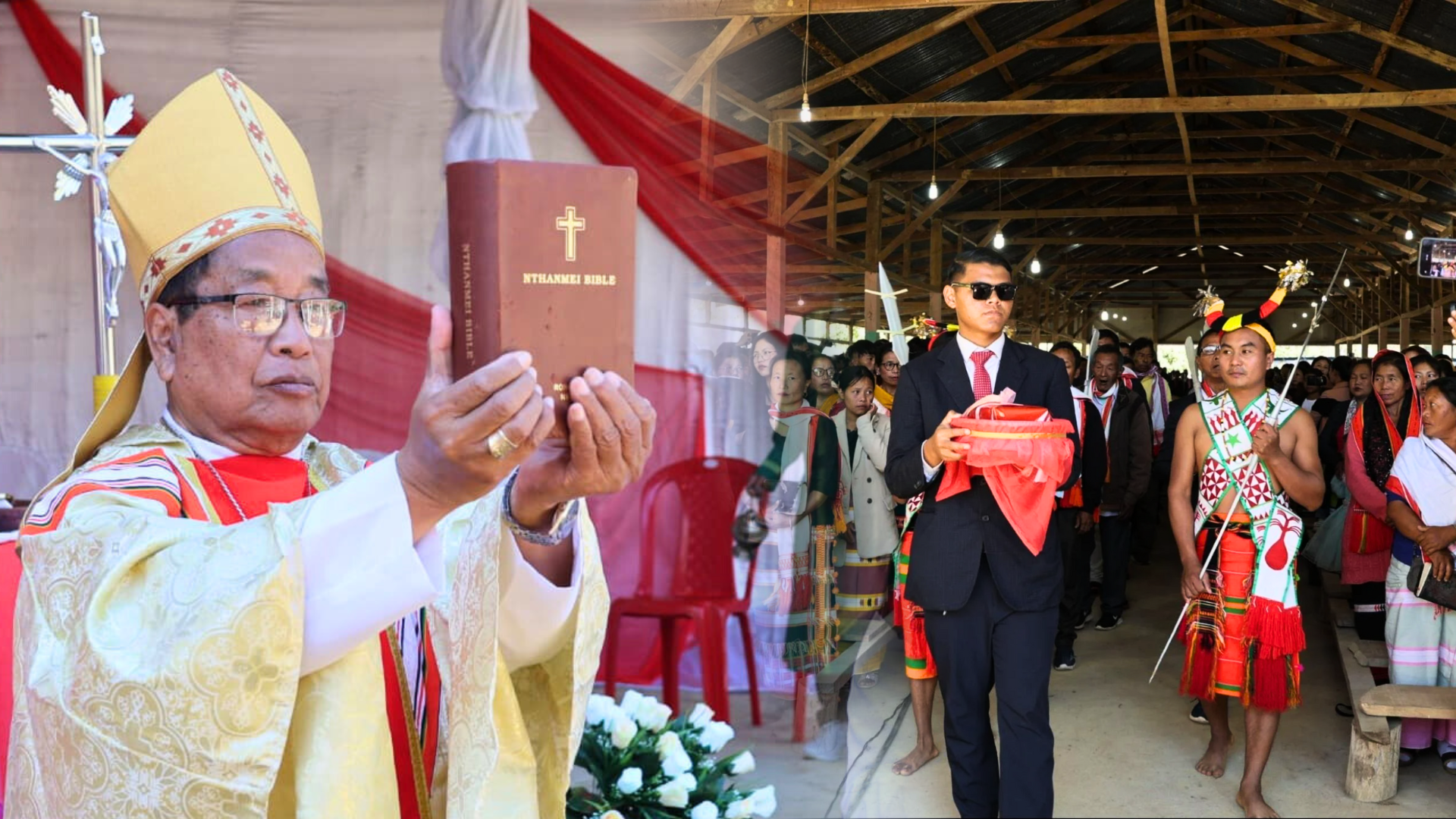 The solemn Eucharistic celebration was held at the Family of Faith Retreat Centre, Tengkonjang–Khoupum, during which Archbishop Emeritus Dominic Lumon of Imphal formally released and inaugurated the Rongmei Catholic Bible.