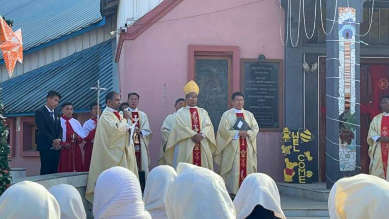 Two solemn Eucharistic celebrations were held simultaneously. While the main diocesan celebration took place at St. Joseph’s Cathedral, Imphal, a separate Jubilee Mass was celebrated at Good Shepherd Parish, Lamka, for the Kuki-Zo Catholic community. This arrangement was made in view of the ongoing ethnic violence between the Meitei and Kuki-Zo communities since 3 May 2023.