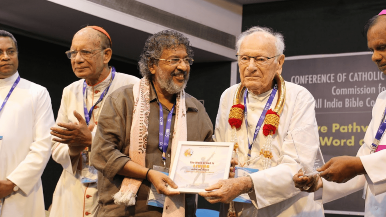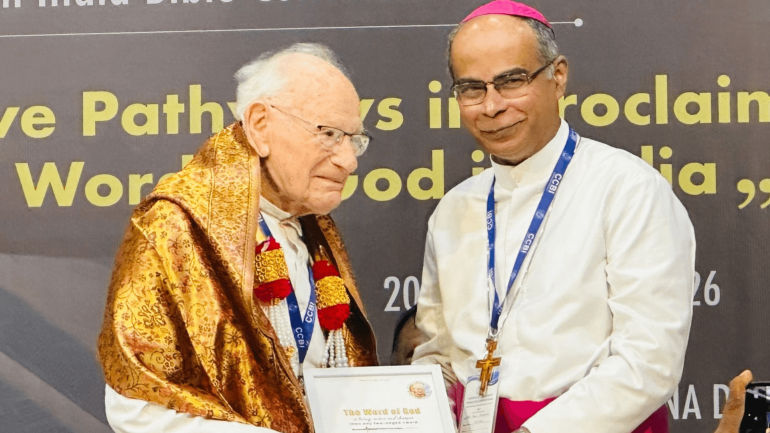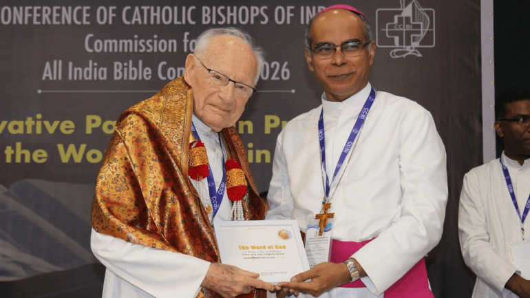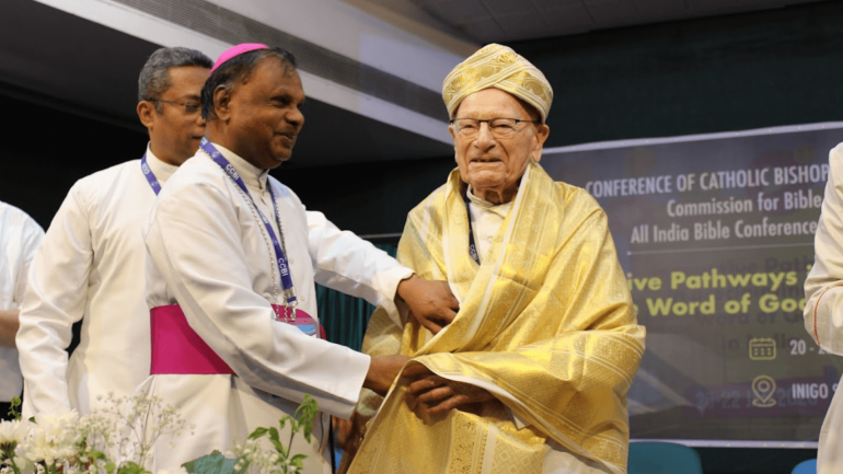 Church leaders in India honoured renowned MEP missionary and eminent biblical scholar Fr. Lucien Legrand for his 70 years of dedicated service to the Word of God, during the All India Bible Conference organised by the Conference of Catholic Bishops of India (CCBI) – Commission for Bible.