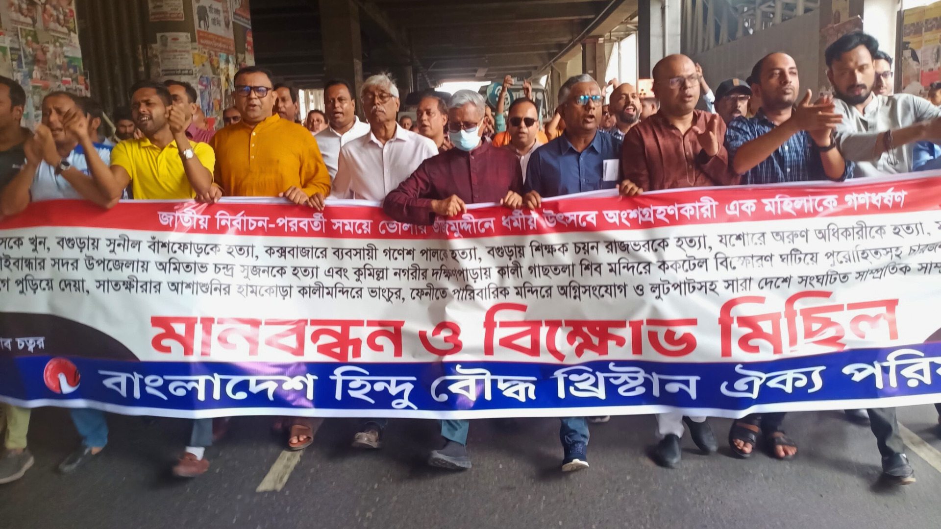 The demonstration was jointly organized by the Bangladesh Hindu Buddhist Christian Unity
