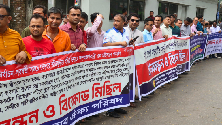 Speakers also referred to recent attacks across different regions, including the gang rape of a woman returning from a religious festival in Tajumuddin. Other incidents were reported in Chittagong, Bogura, Cox’s Bazar, Mymensingh, Jessore, and Gaibandha.