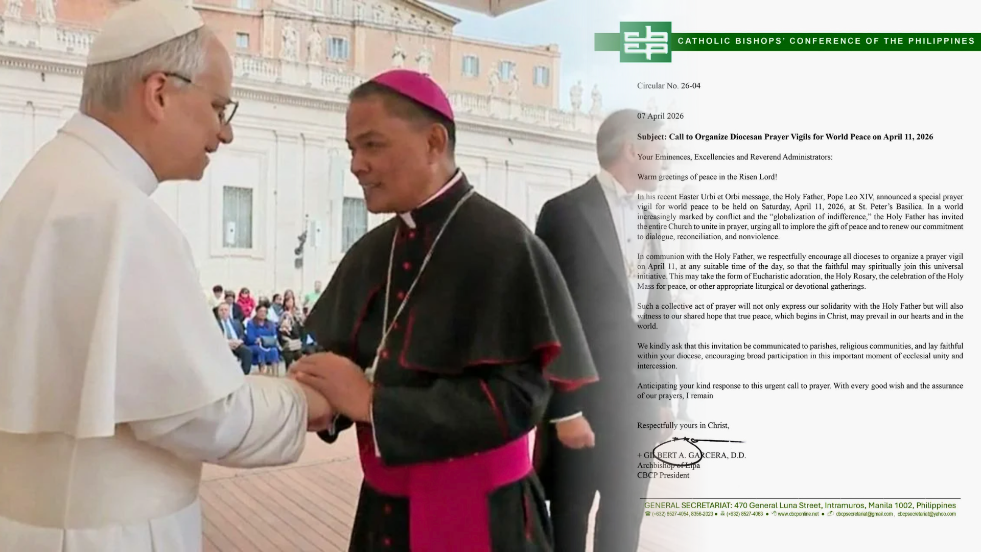 The Catholic Bishops' Conference of the Philippines (CBCP) has urged all dioceses nationwide to organize prayer vigils for world peace on April 11, 2026, in response to the appeal of Pope Leo XIV.