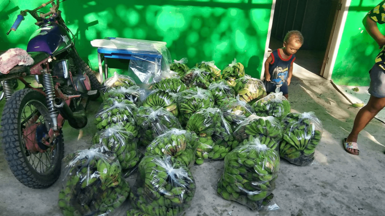 The vegetables—bananas, sweet potatoes, bitter gourd, eggplants, long beans, and squash—are grown on ancestral land farmed collectively by the community.