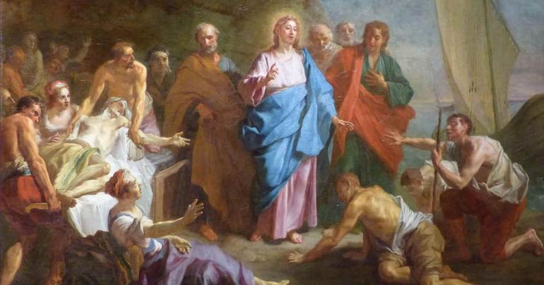 When Jesus heard of the death of John the Baptist, he withdrew in a boat to a deserted place by himself. The crowds heard of this and followed him on foot from their towns. When he disembarked and saw the vast crowd, his heart was moved with pity for them, and he cured their sick. Matthew 14:13–14