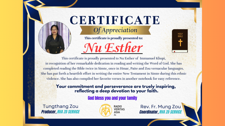 Esther, a Catholic woman from the Manipur state of northeastern India, was interviewed by Tungthang Zou, RVA Zo Service producer while receiving a memento for her extraordinary commitment to reading and transcribing the Bible.
