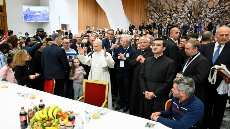 “With great joy we gather for this meal on this day so dearly desired by my beloved predecessor, Pope Francis,” said Pope Leo XIV, inviting warm applause for the Pope Emeritus who instituted this annual celebration.